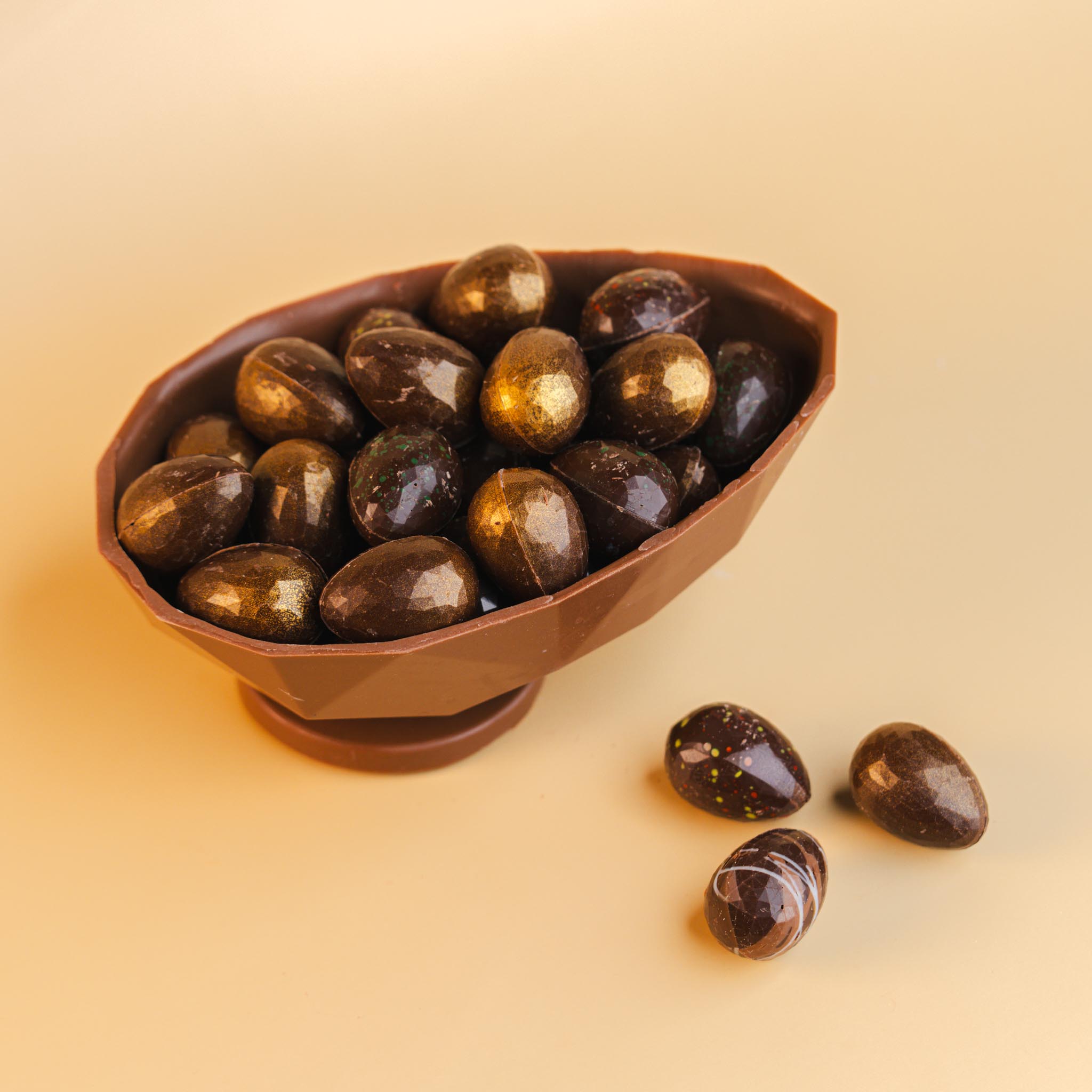 Dit paasnestje van chocolade is gevuld met een heerlijke mix van gevulde paaseitjes en vormt een feestelijke traktatie voor Pasen.